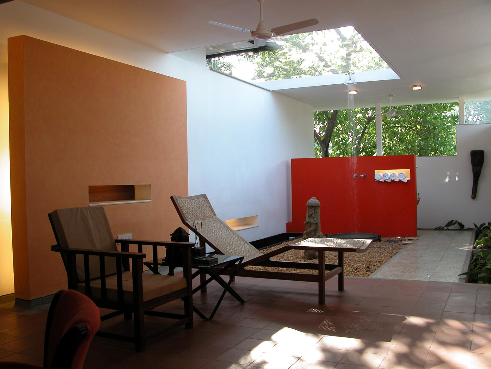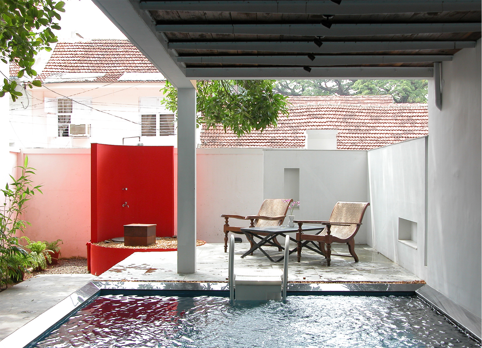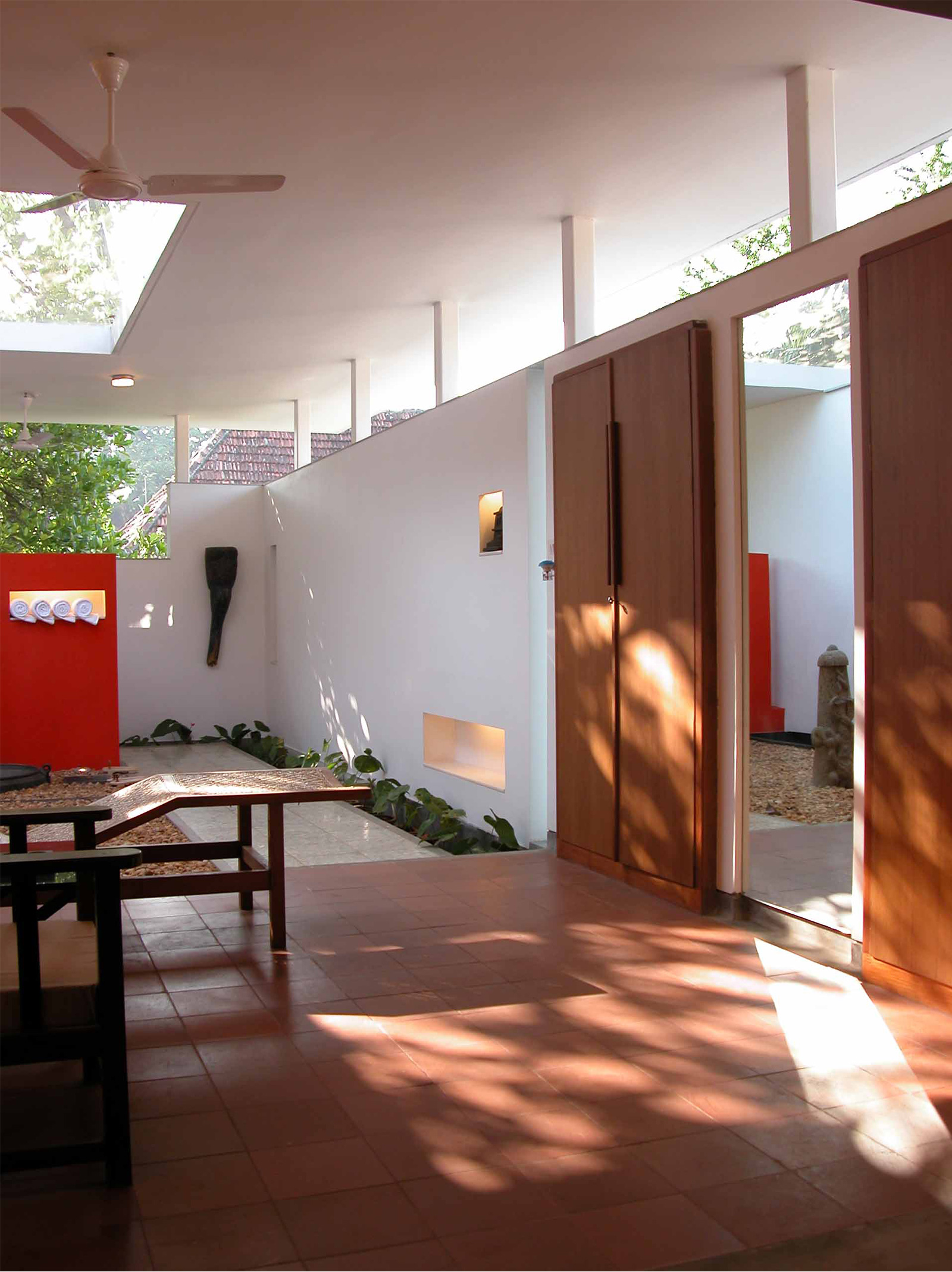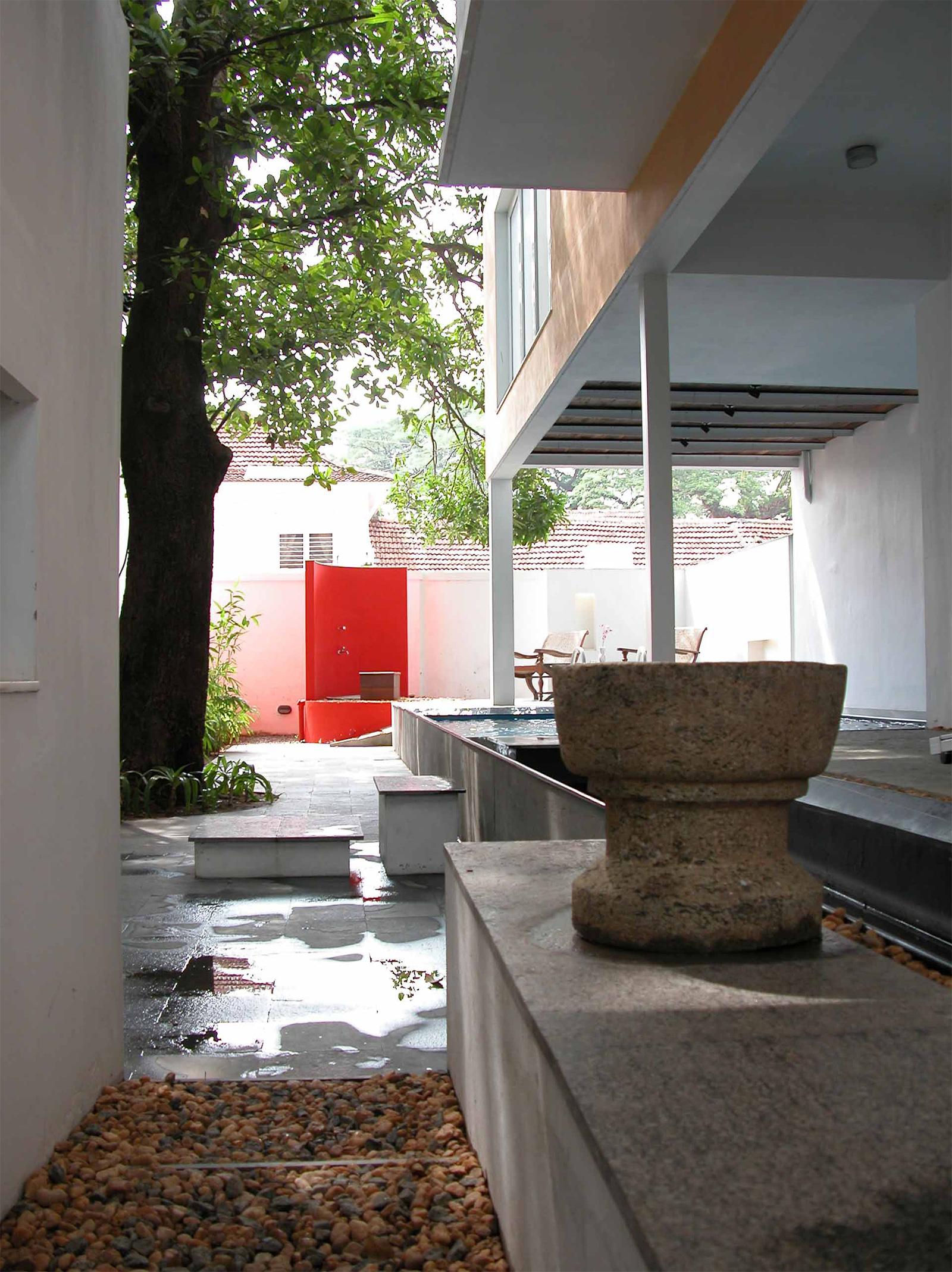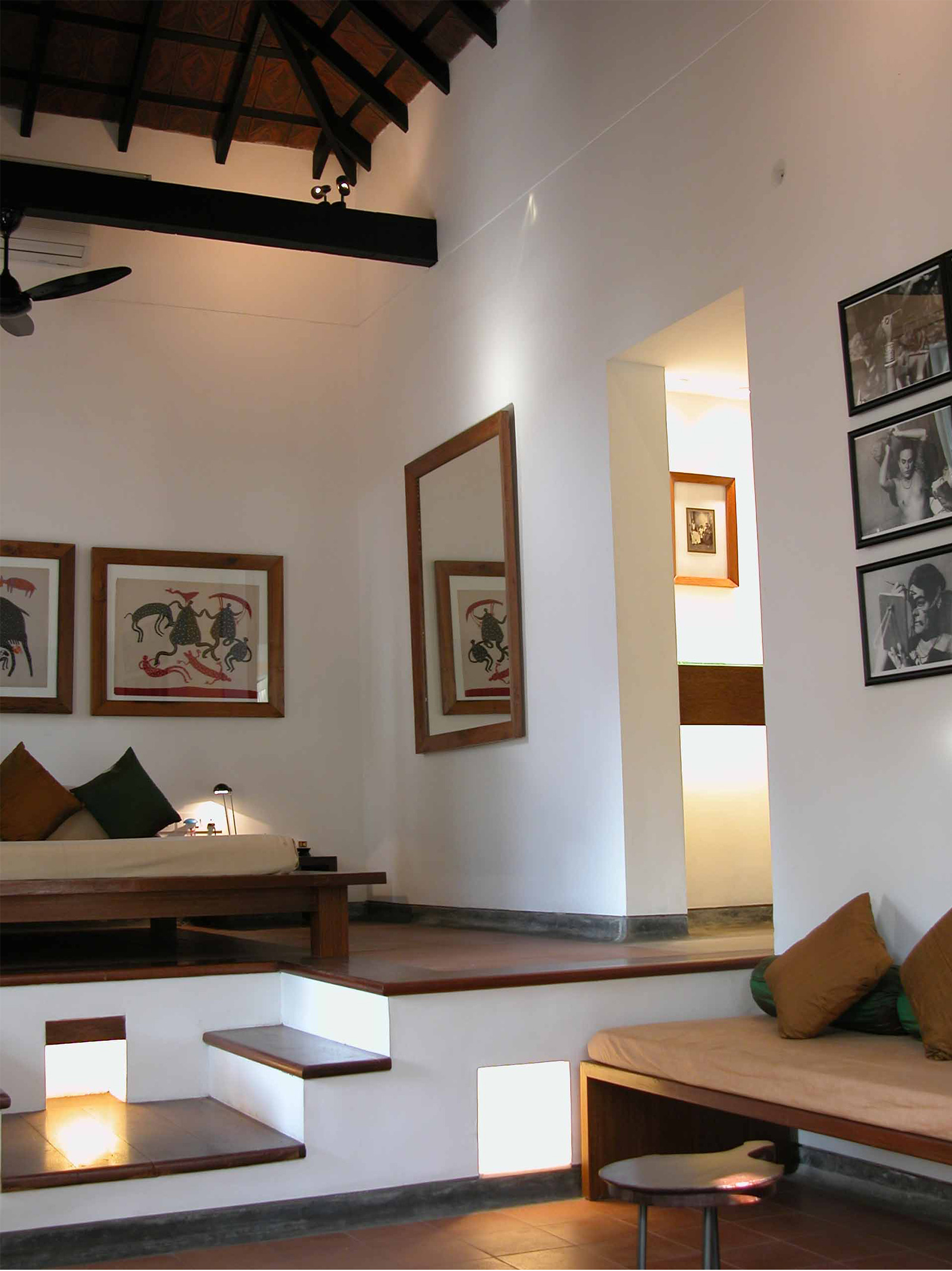 Each of the three rooms unfolds within interior open to sky courtyards / verandah and semi-covered toilet / baths. The envelope of the rooms, their individual courtyards capture the view of surrounding green foliage and neighboring tiled roofs The entire setting is very spare to enhance the feeling of lightness and space in the often-dark rainy days in Kerala. The ‘insert’ has a clear identity in the manner in which it plugs into the old structure and avoids replicating the older building structure or its characteristics, this is a deliberate decision. The clear separation of the old and the new is highlighted by the re-positioning the older objects / furniture in the contemporary setting – yet in a larger picture of a heritage zone. The effort is to bring forth an ‘authentic’ contemporary Indian design work that reflects upon the present time, the location & context and the sense of space / light in an ‘equally authentic’ yet older structure encapsulating it.